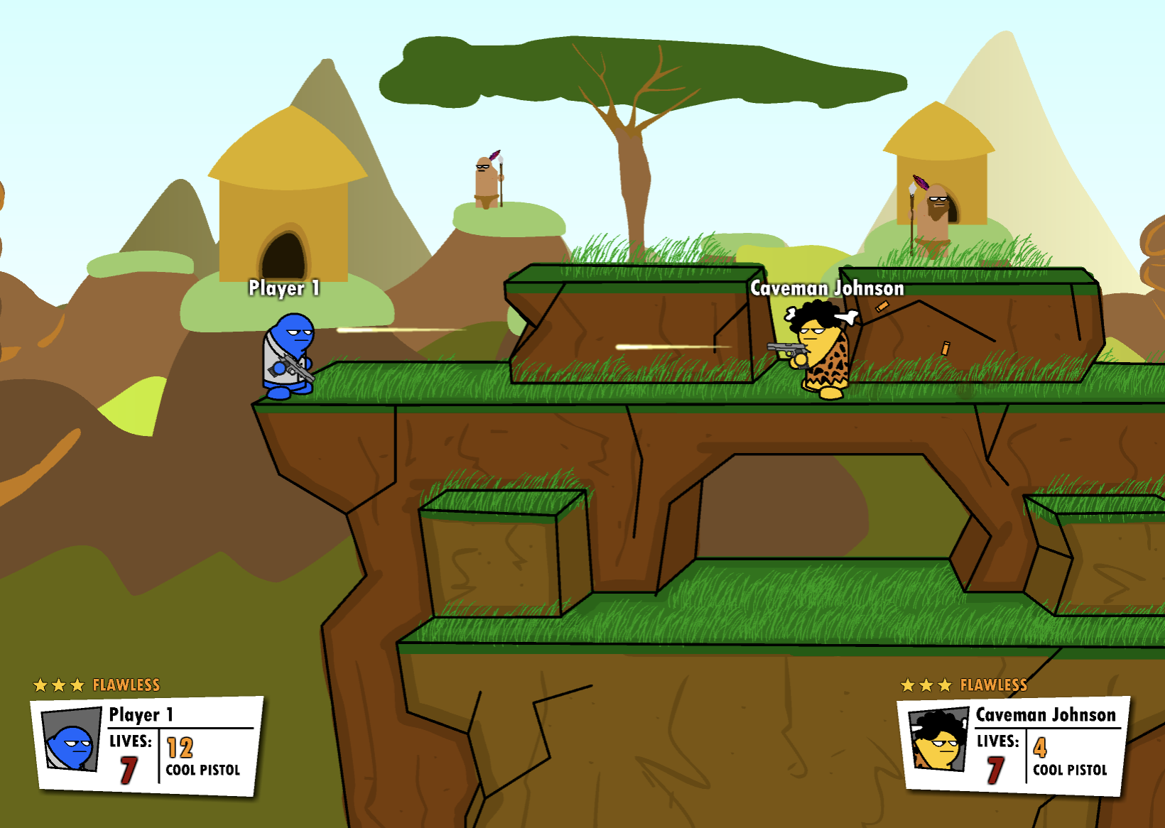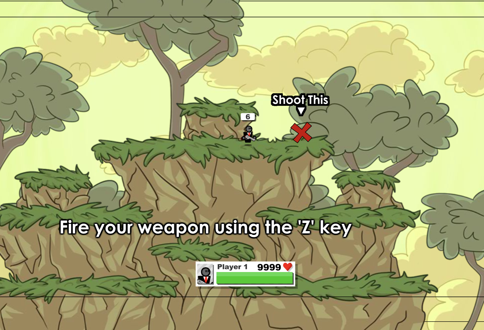 게임 목표는 상대를 맵 바깥으로 밀어내거나 체력을 깎아 KO시키는 것입니다. 그리고 무기는 맵 위에 랜덤 생성되며, 다양한 총기와 폭탄이 존재해 전략적인 플레이가 가능합니다.