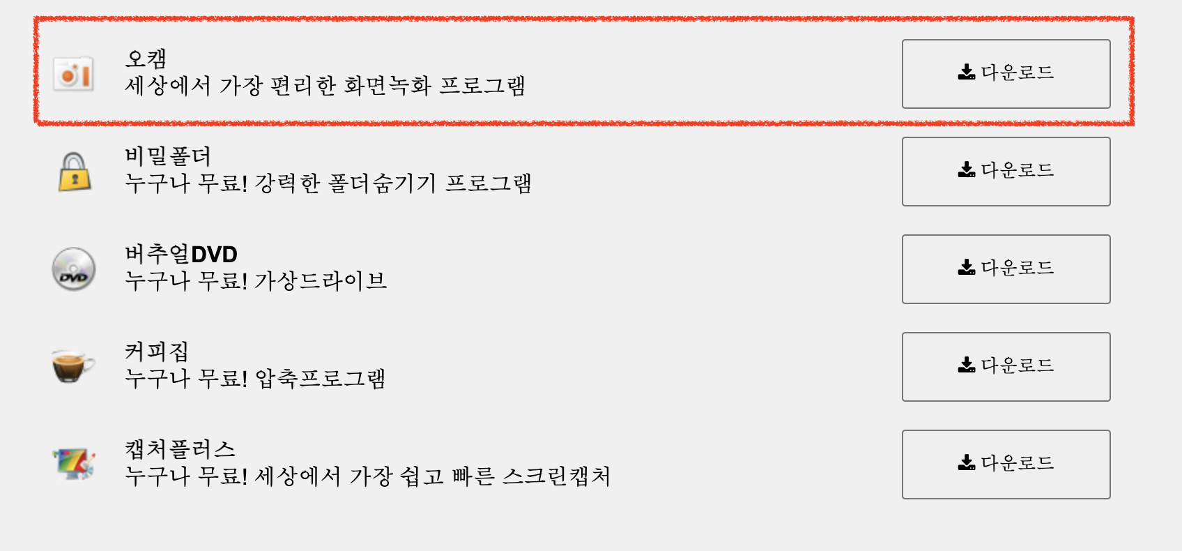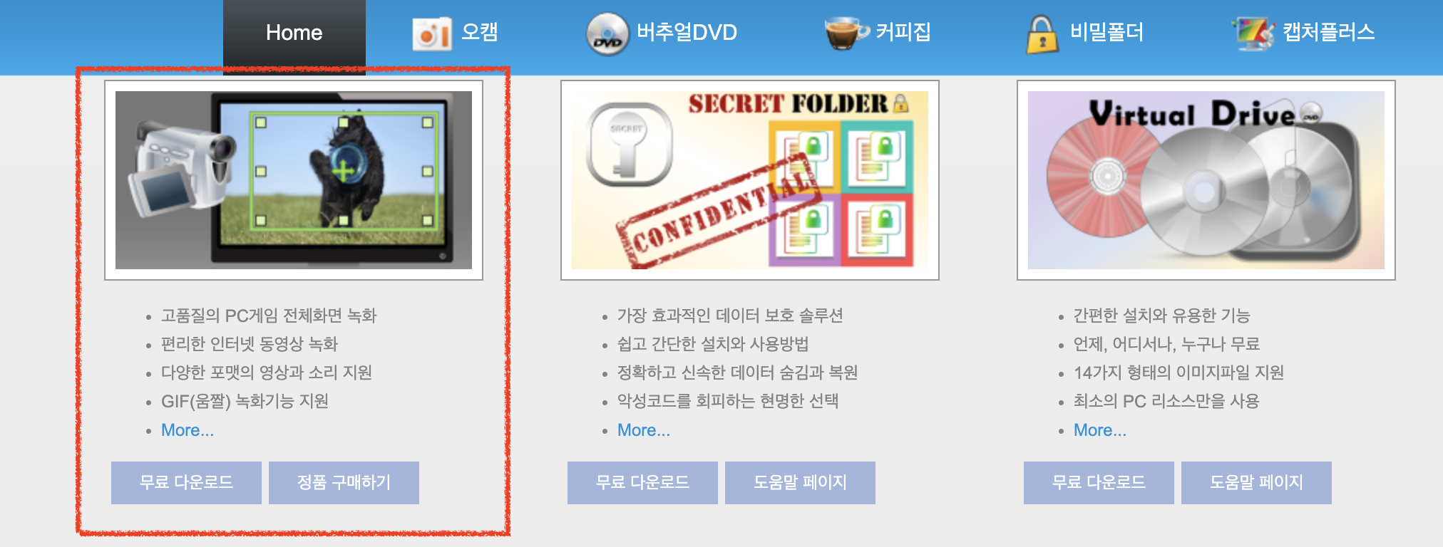 오캠(oCam) 프로그램은 공식 홈페이지에서 무료로 다운로드 받을 수 있게 올려두었기 때문에 자신의 운영체제 및 사양에만 적합하다면 누구나 다운로드 설치가 가능합니다. 너무 구형 pc만 아니면 대부분 이용이 가능하기 때문에 바로 받아 보시면 됩니다. 아래의 버튼을 통해 오캠 홈페이지로 이동한 뒤 하단의 'download' 버튼을 누르면 설치 파일을 컴퓨터에 저장할 수 있습니다. 오캠 외에도 비밀폴더, 비주얼 DVD, 커피집, 캡처플러스 등의 같은 회사 프로그램들도 있으니 필요하신 분들은 함께 설치하시면 됩니다.