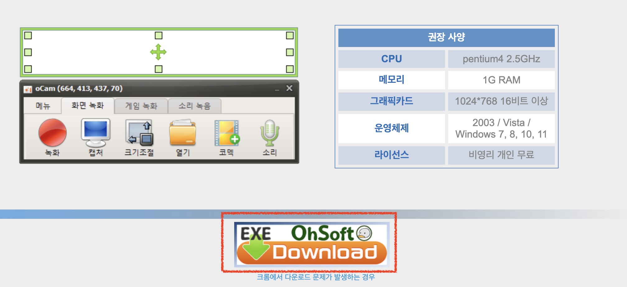 오캠(oCam)은 요즘 프로그램은 아니기 때문에 사양을 크게 잡아먹지는 않습니다. 간단한 만큼 프로그램도 가볍기 때문에 너무 옛날 pc 모델만 아니면 무리 없이 작동이 됩니다.