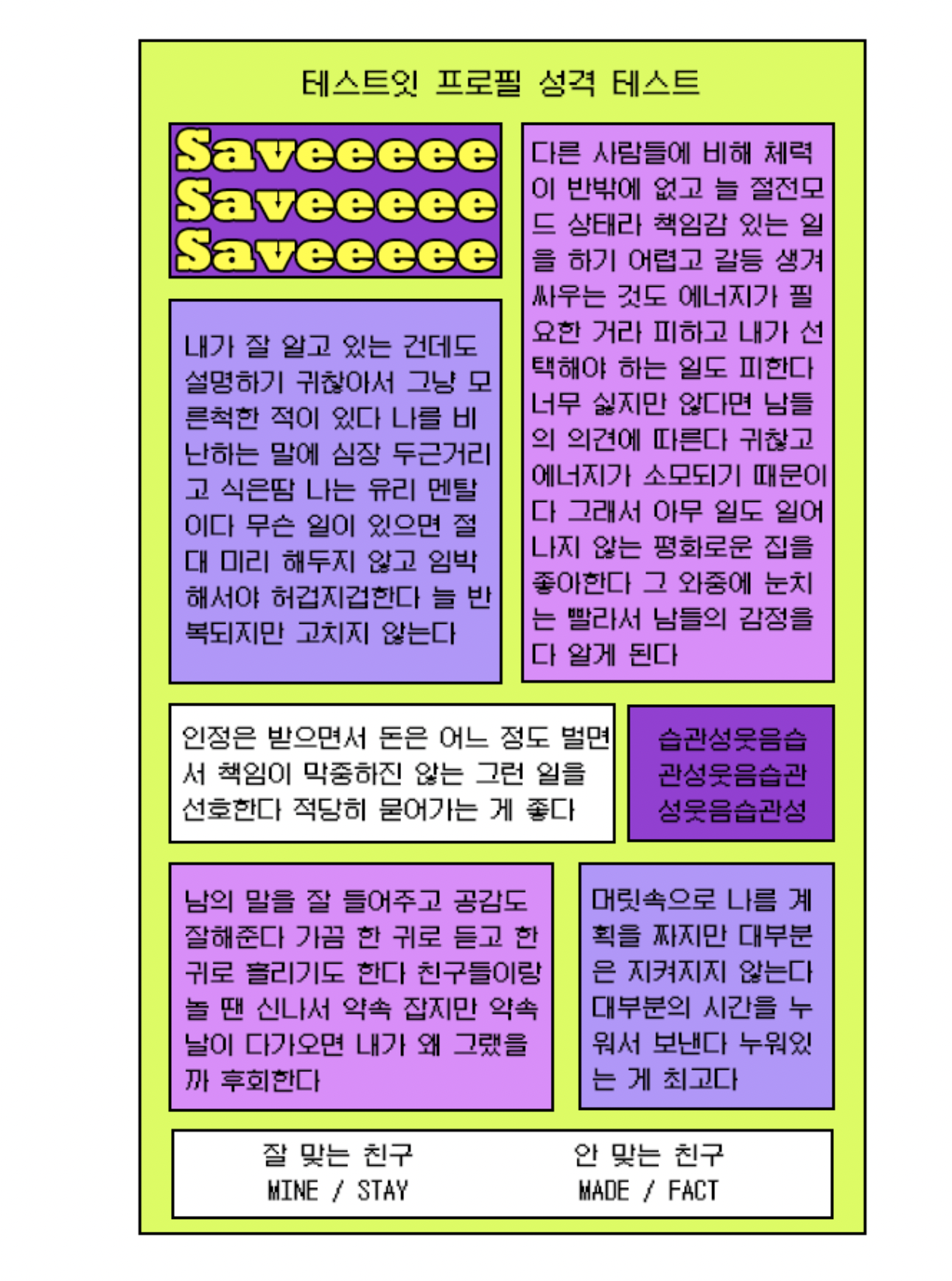 뭔가 힙하고 레트로한 느낌으로 테스트 결과를 받아보았는데 너무 구구절절 맞는 소리들 뿐이라 재밌긴 했습니다. 저는 아무래도 상단에 보이는 'SAVE' 유형으로 분류된 것 같습니다. 하단에 잘 맞는 친구와 안 맞는 친구 유형도 있는데 혼자서 한 거라 다른 유형은 어떤 성격의 사람인지 모르니 그 부분은 아쉬웠습니다. 저 간단한 문항으로 어찌 파악할 수 있는 건지 심리테스트는 참으로 재밌는 거 같습니다.