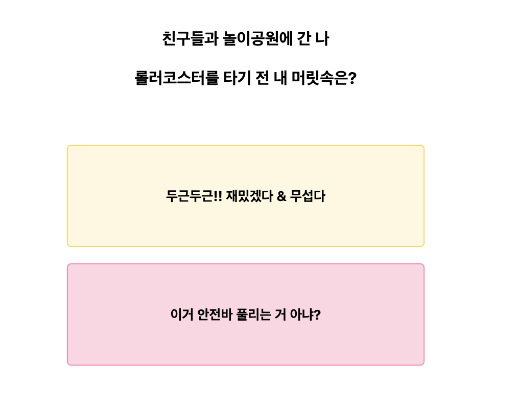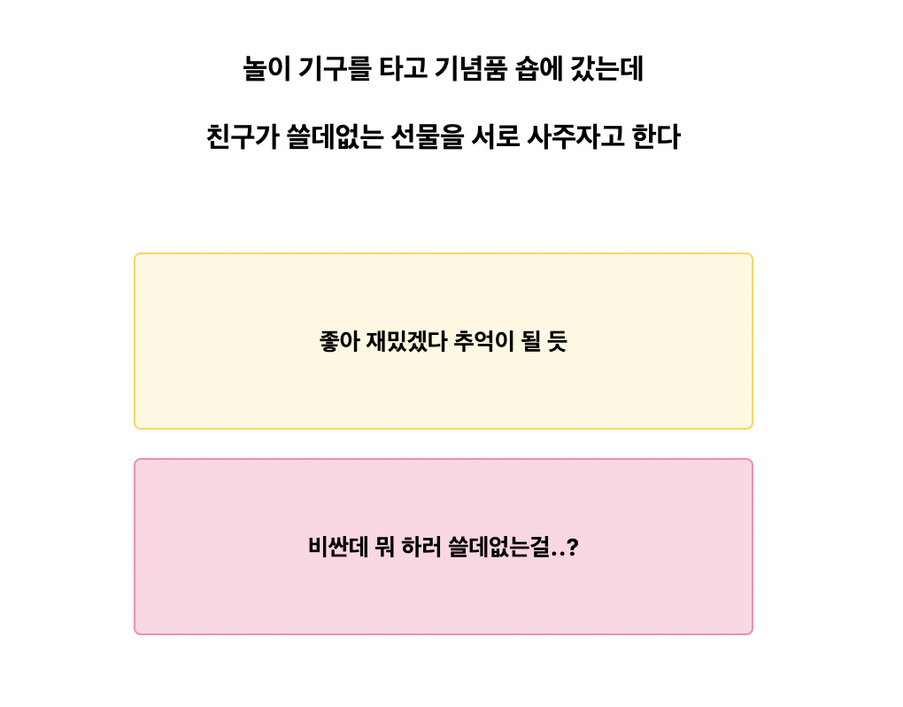 요즘은 너무 어려운 질문이나 뻔한 질문들로 구성된 심리테스트가 굉장히 많이 나오는데 간만에 현실성 있는 질문들이라 흥미롭게 하기 좋았습니다. 또한, 거의 10문항 미만으로 빠르게 휙휙 넘어갈 수 있어서 시간도 오래 잡아먹지 않습니다.