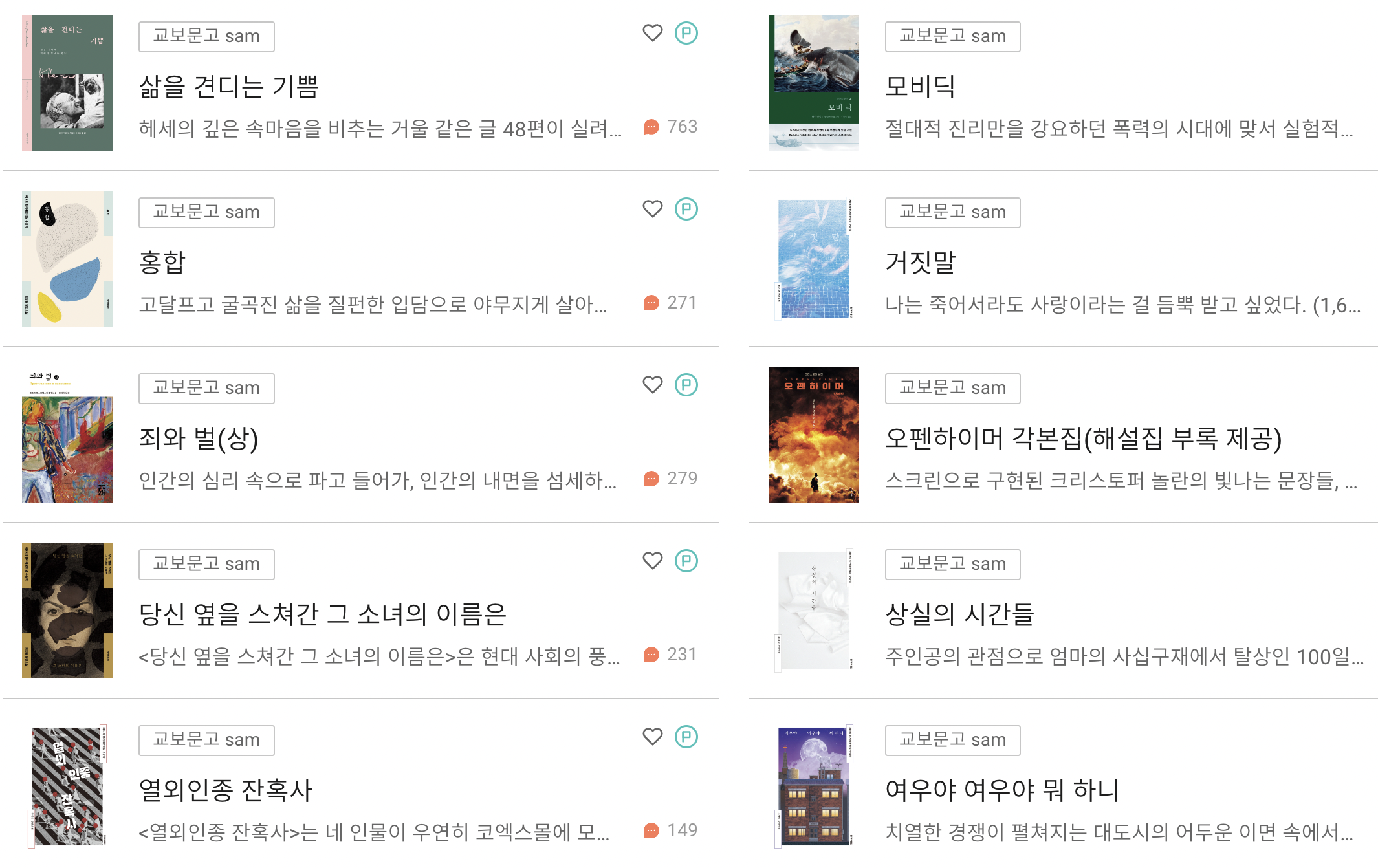 이전에 해당 책의 필사를 진행한 사람들의 책 후기를 이모티콘으로 확인해볼 수 있어서 책을 고르는 재미도 쏠쏠할 것 같습니다. 전체적으로 다 유명한 베스트셀러 위주로 모여있기 때문에 책을 좋아하시는 분들은 필사 해보는 것을 추천드립니다.