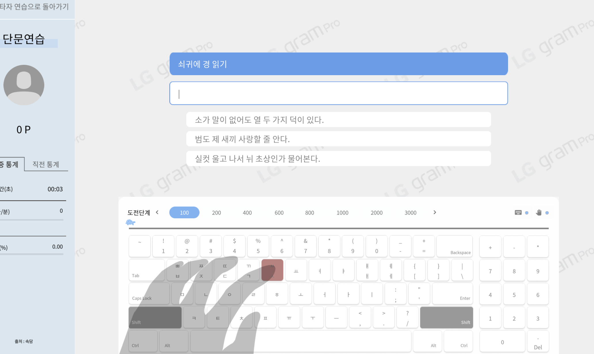 - 낱말 연습 : 랜덤한 낱말이 나오면 타자로 해당 단어들을 타이핑 하면서 속도를 익힐 수 있는 단계